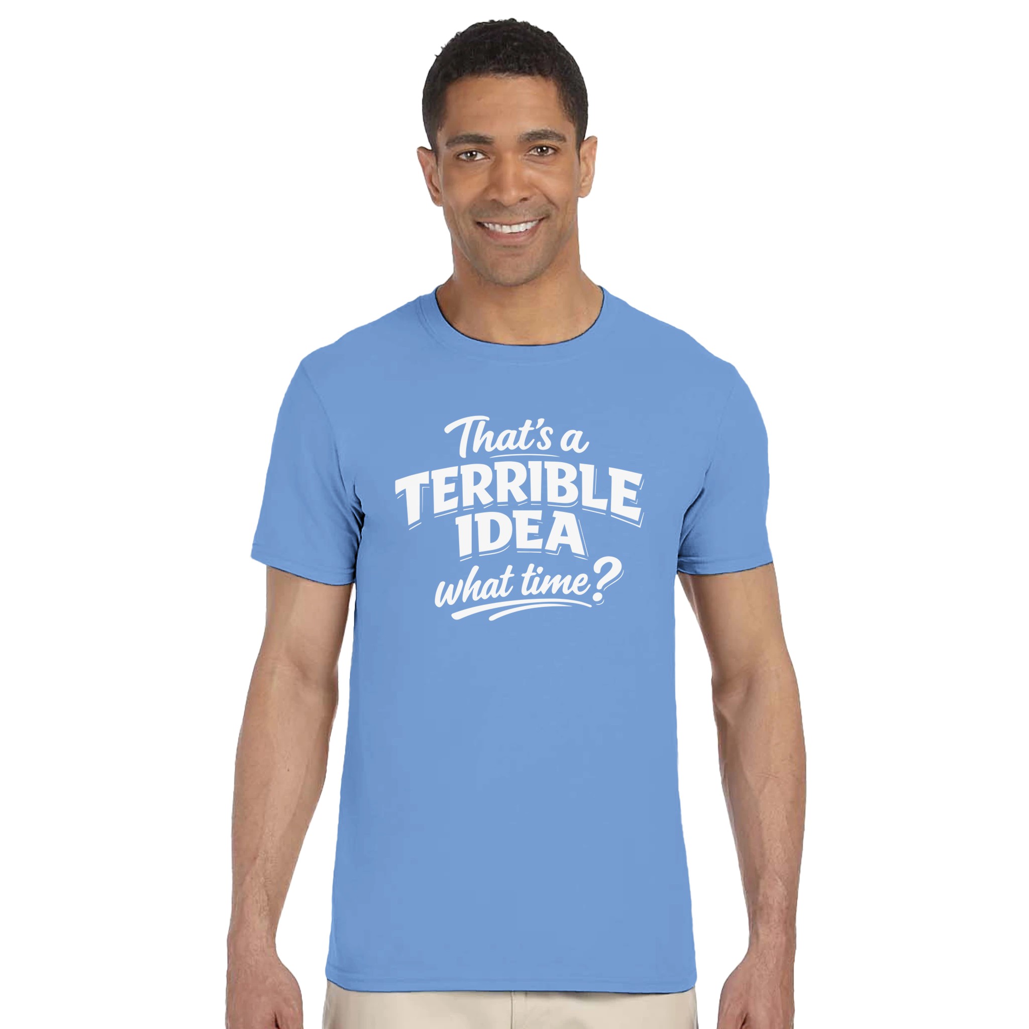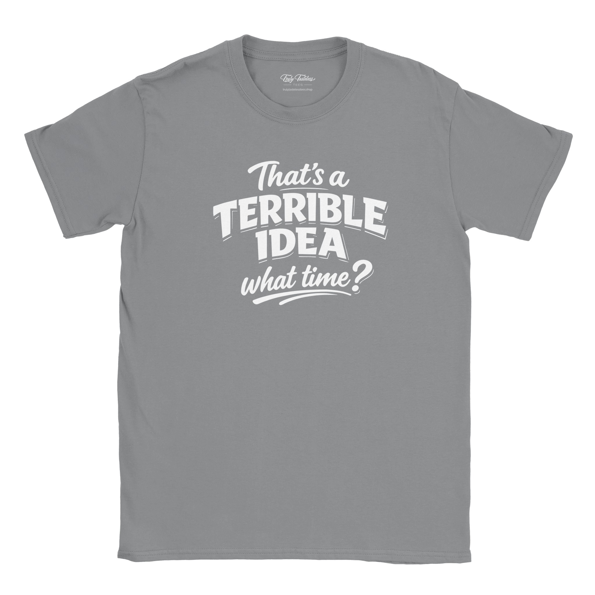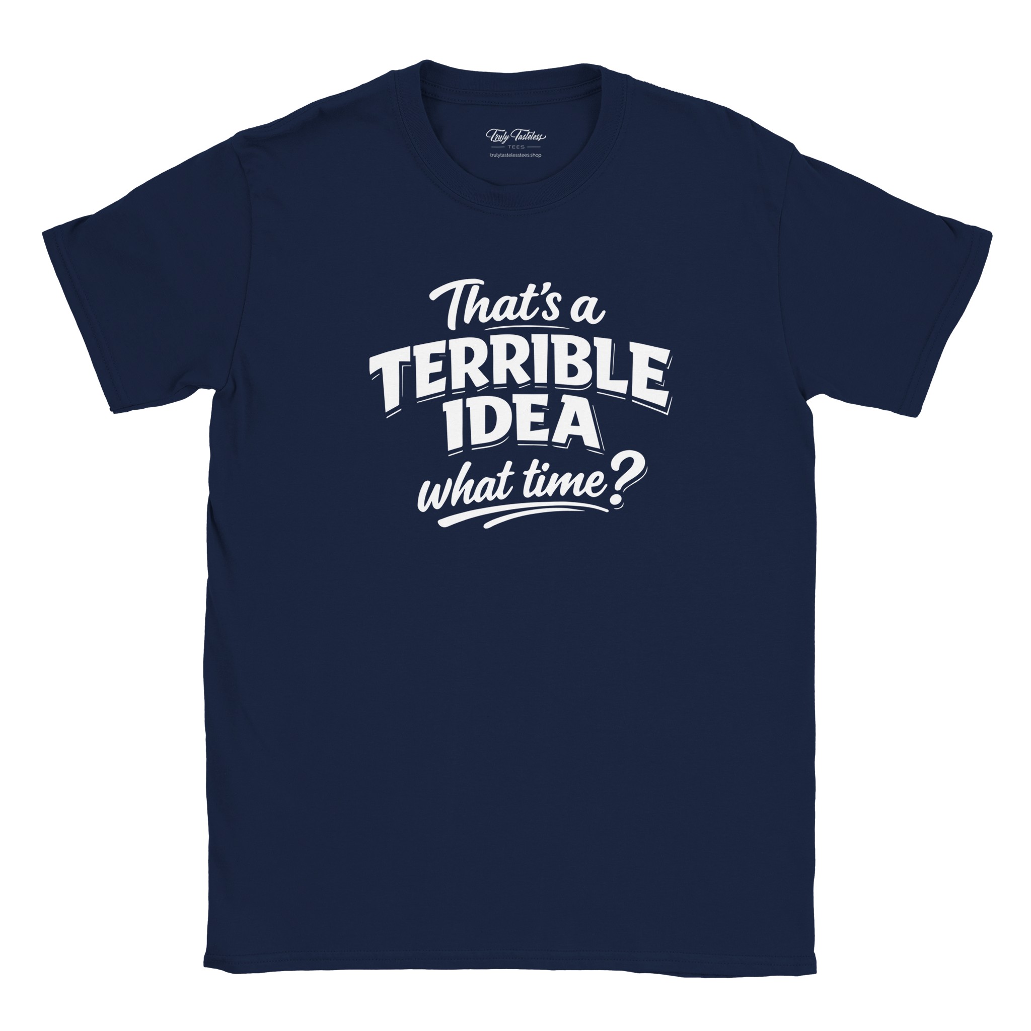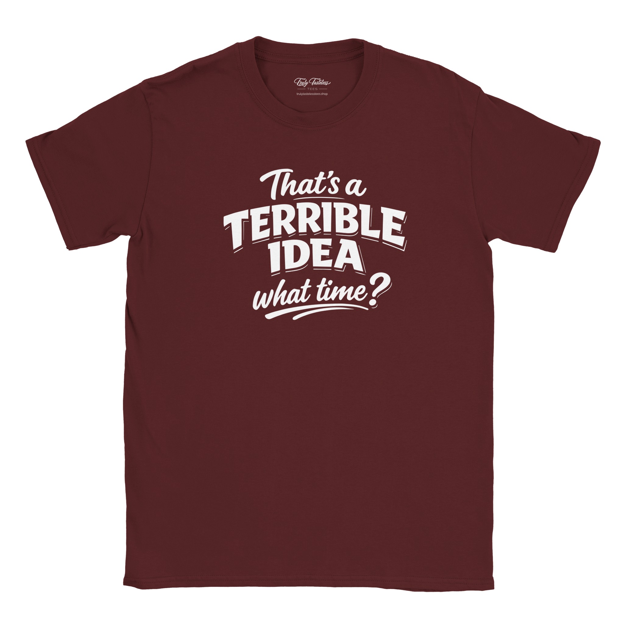 Whether you’re looking for a unique gift, a conversation starter, or just a comfortable tee that speaks your mind, this t-shirt is a fantastic choice. Add a dose of humor to your wardrobe today – it might be a terrible idea, but it’ll be a hilarious one!